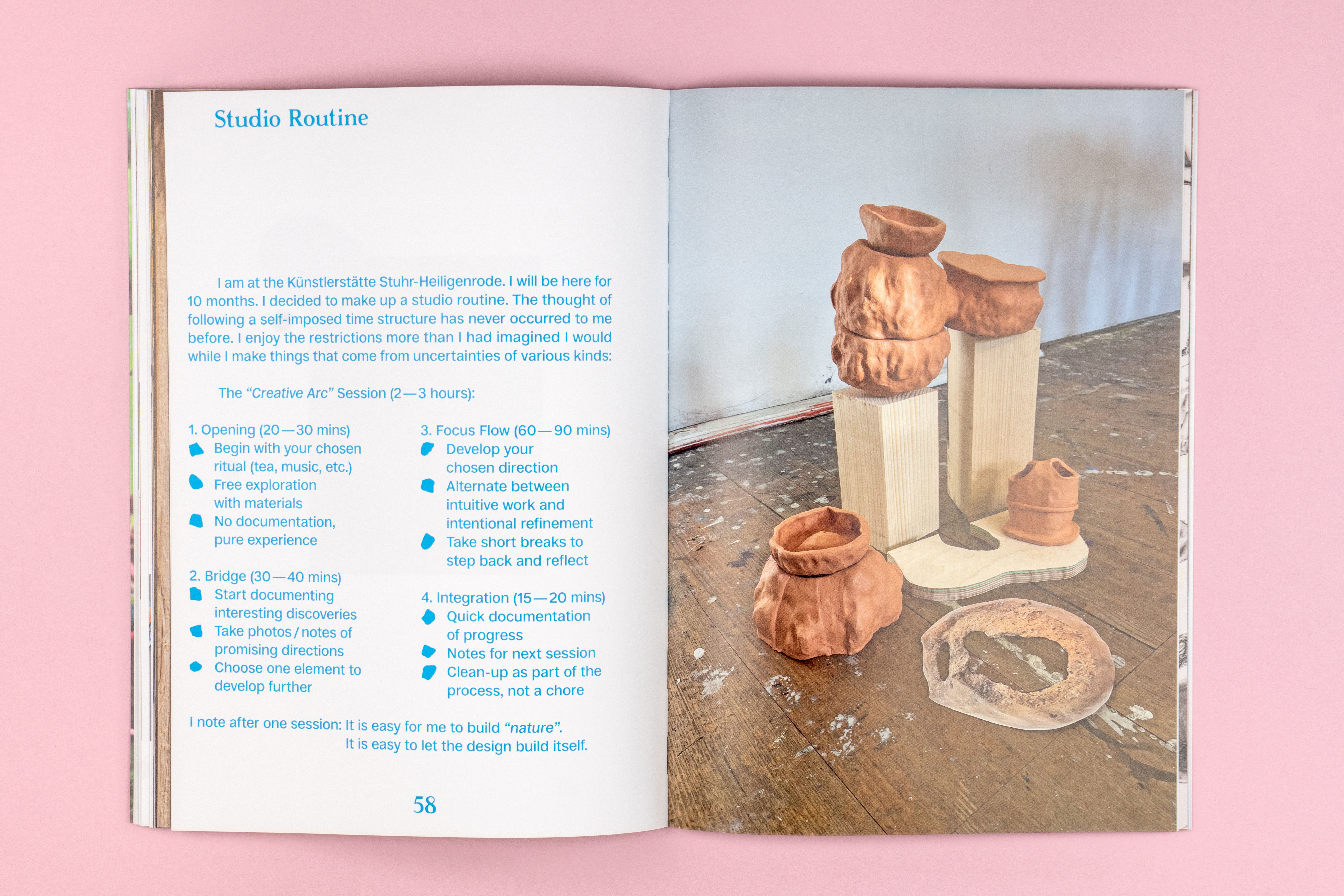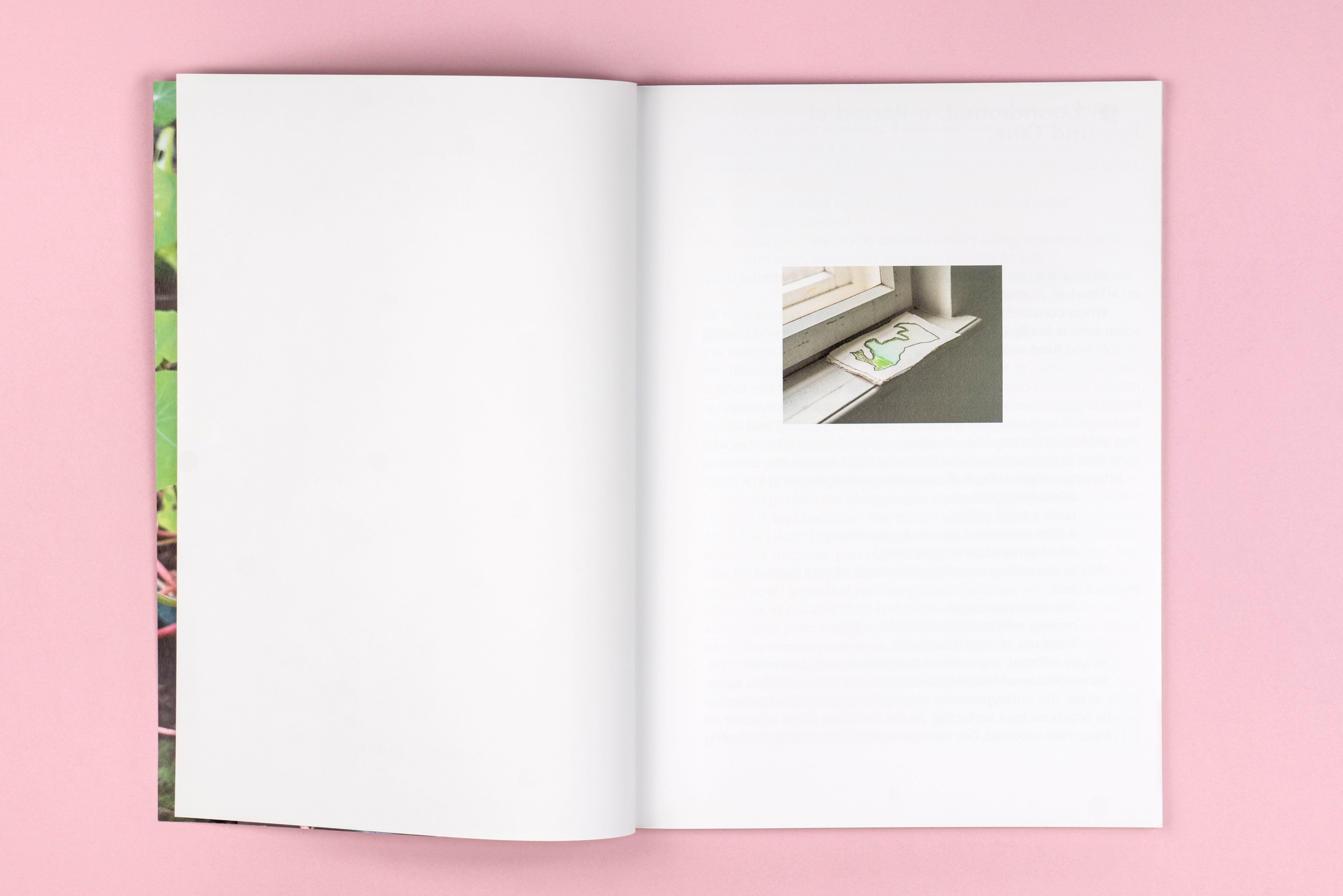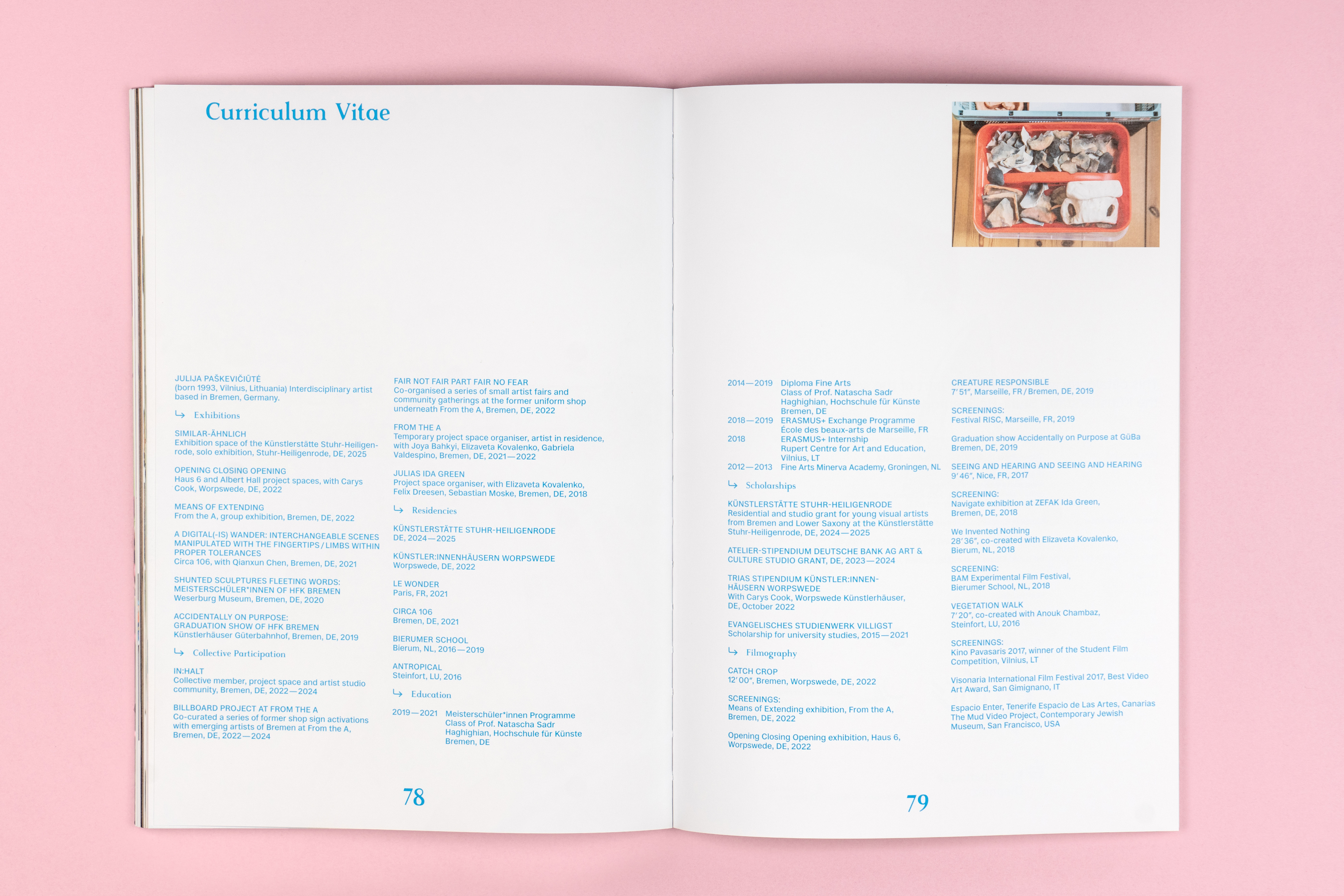The book contains photos of Sabine Peter, Joya Bahkyi, Ul Seo, Aleksandra Weber, Stephan Thierbach and the artist herself. The texts are written by Julija Paškevičiūtė, Angela Lieber and Jasmin Al-Quaisi. Elizaveta Kovalenko and Sabine Peter worked as project assistance for the artist.