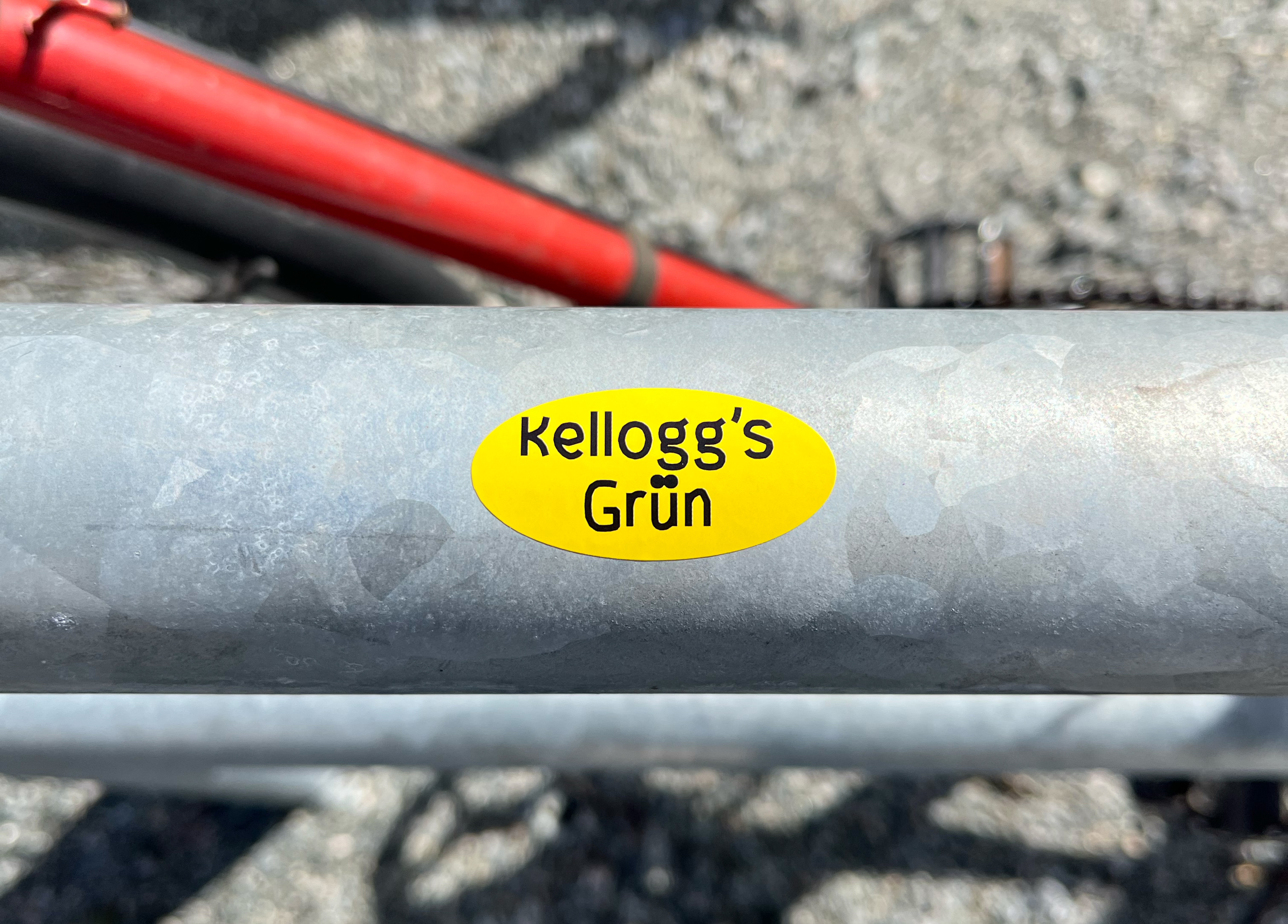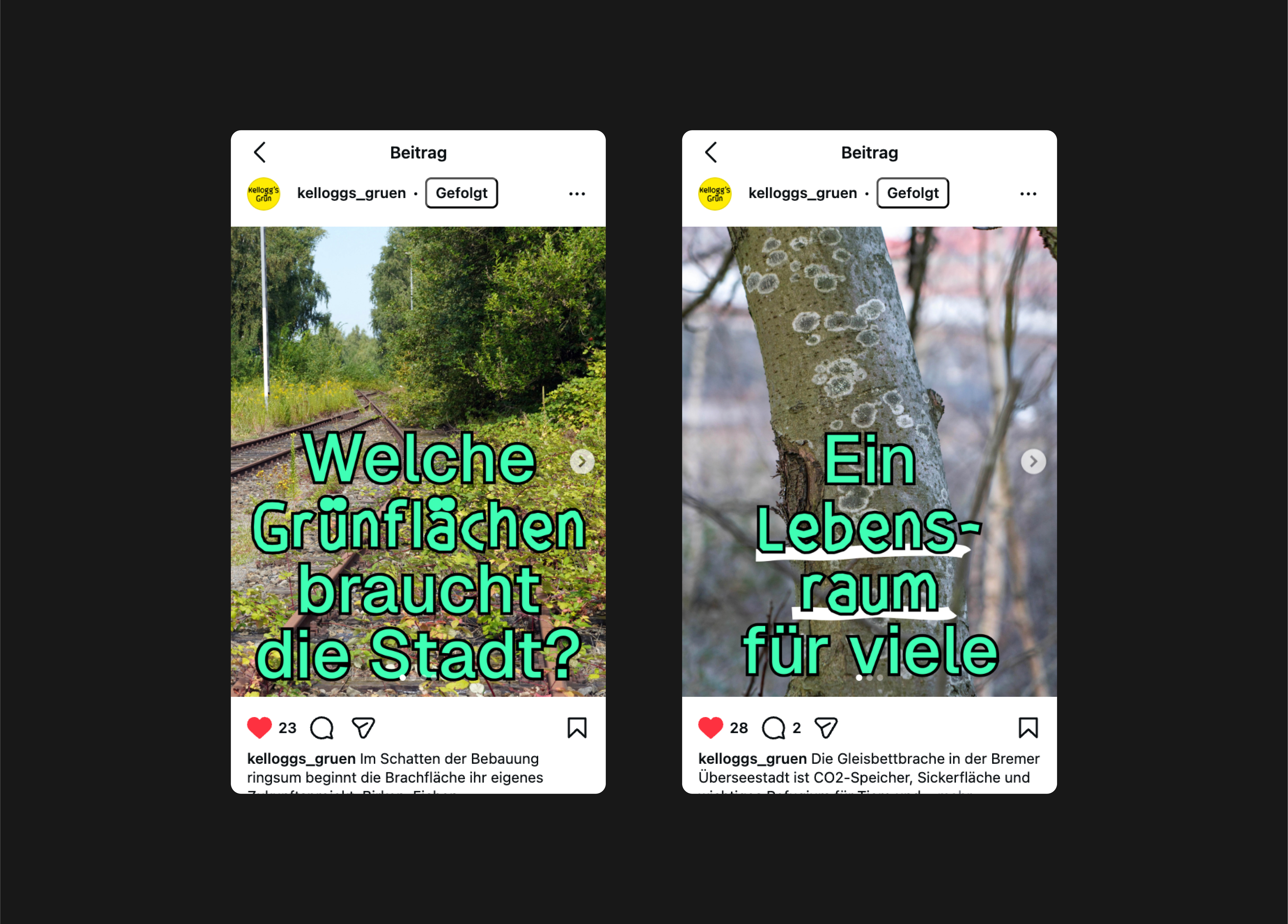 Small visual identity (lettermark logo, flyer, stickers & social media) for the initiative “Kellogg’s Grün”. The initiative is working to prevent land sealing caused by urban development and to preserve a naturally formed fallow area in Bremen’s Überseestadt. An area that is dominated mainly by newly constructed buildings. The lettermark is based on the font “Version”, while the “Geist” font was used for longer parts of the text. The flyers are printed on recycled paper. Get more information @kelloggs_gruen (Instagram-Account).