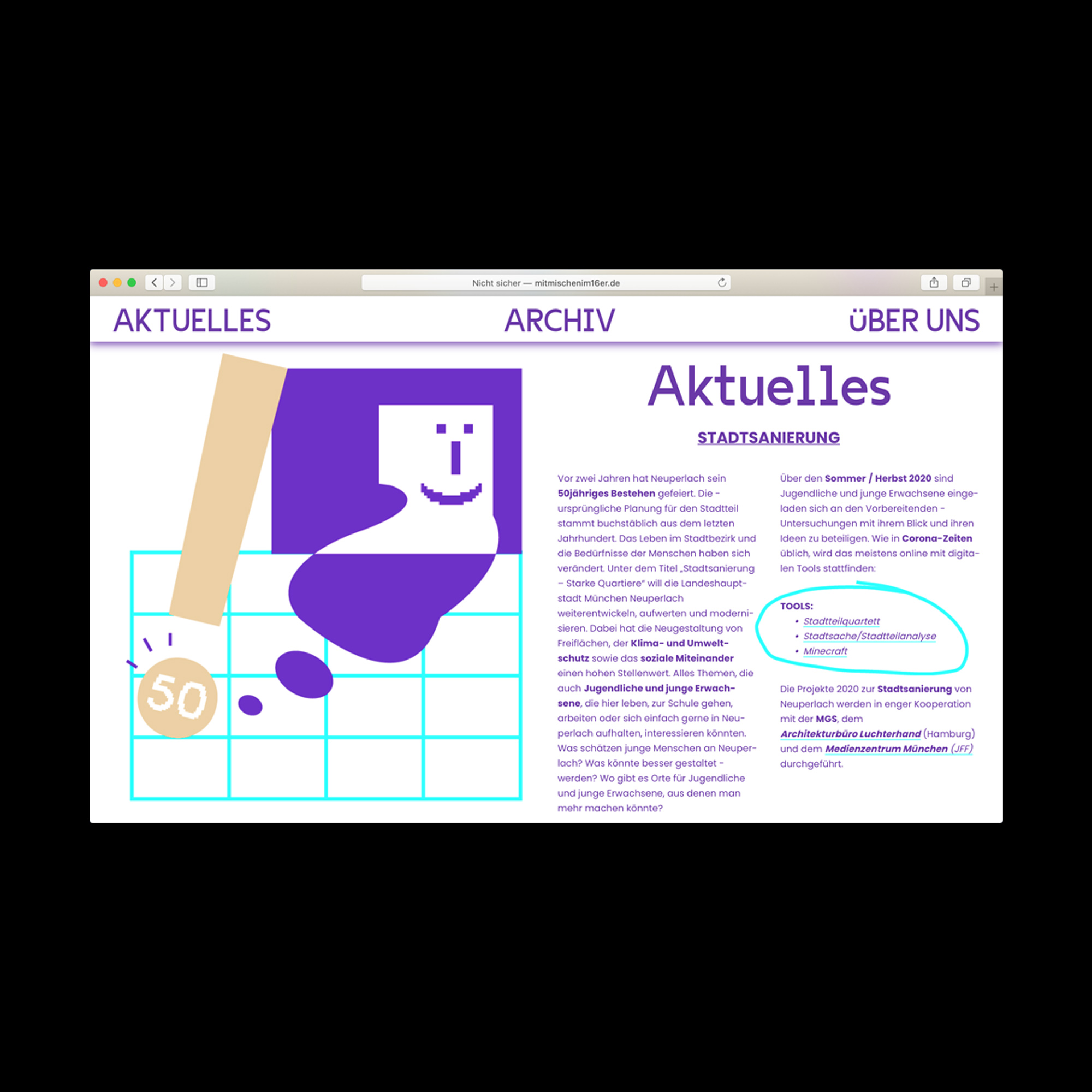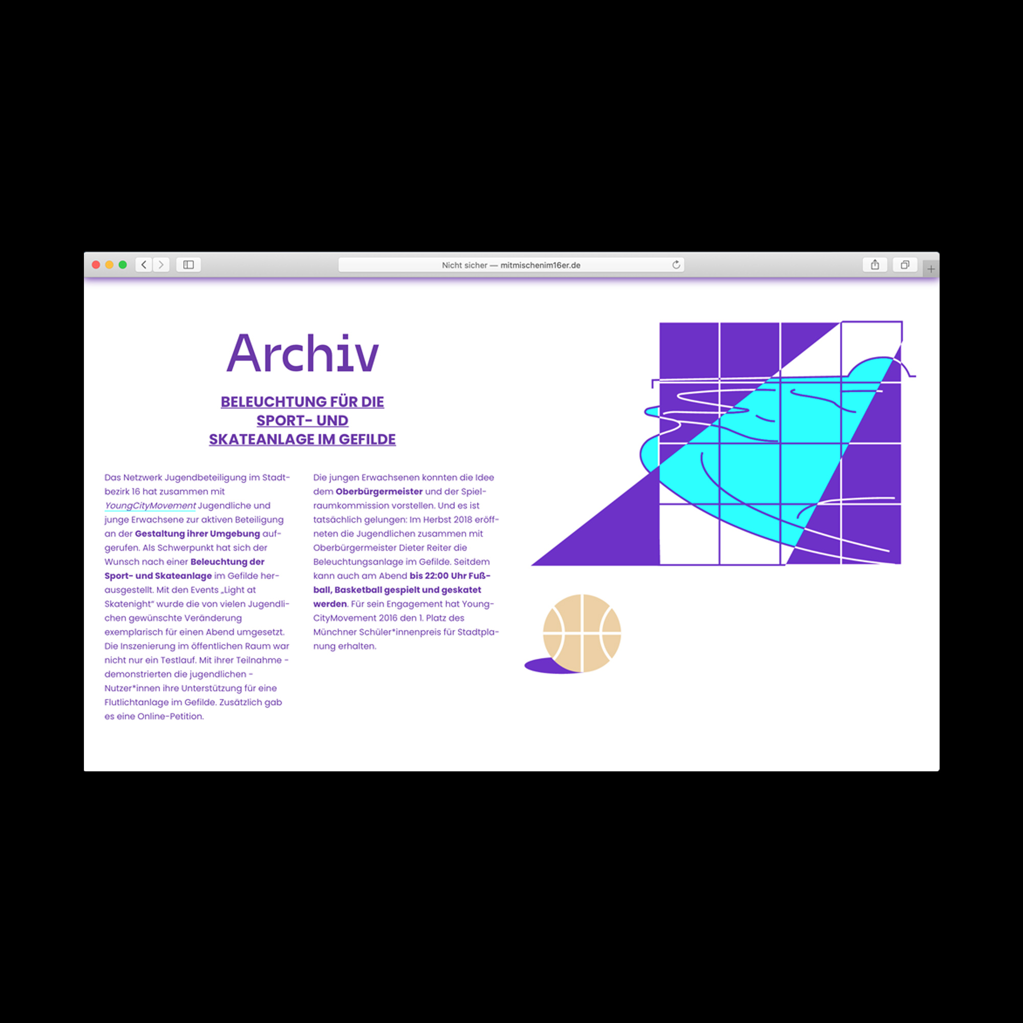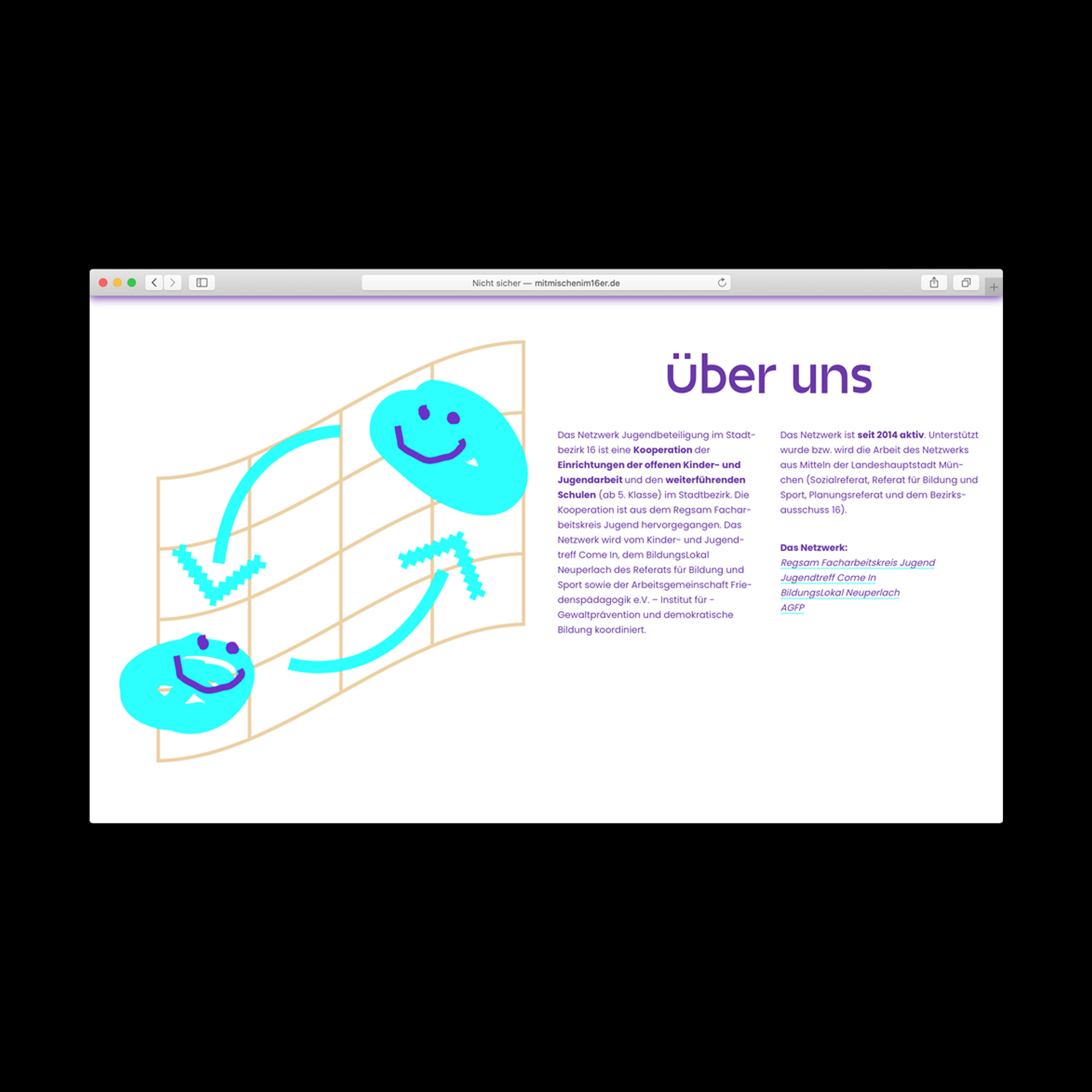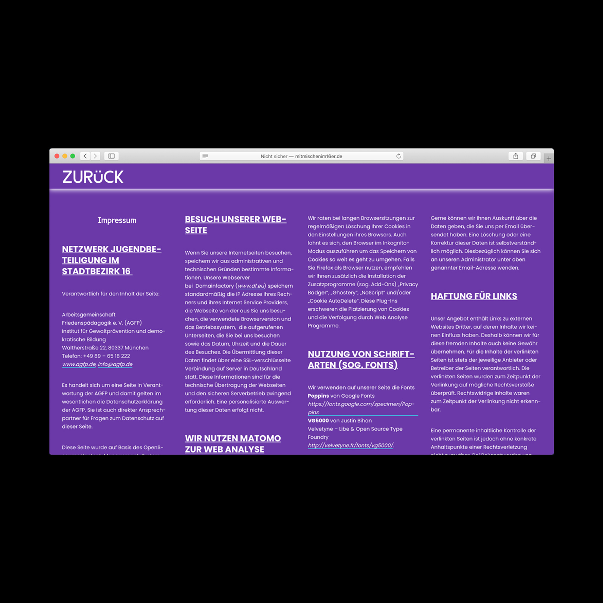Web design for a project by Arbeitsgemeinschaft Friedenspädagogik e. V. (AGFP) that tries to involve teenagers and young adults in planning free urban space in a city district in Munich. Coding by Fabian Brunke.