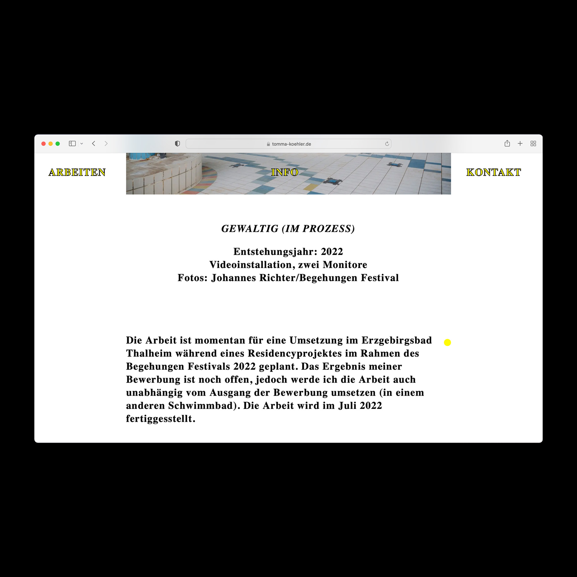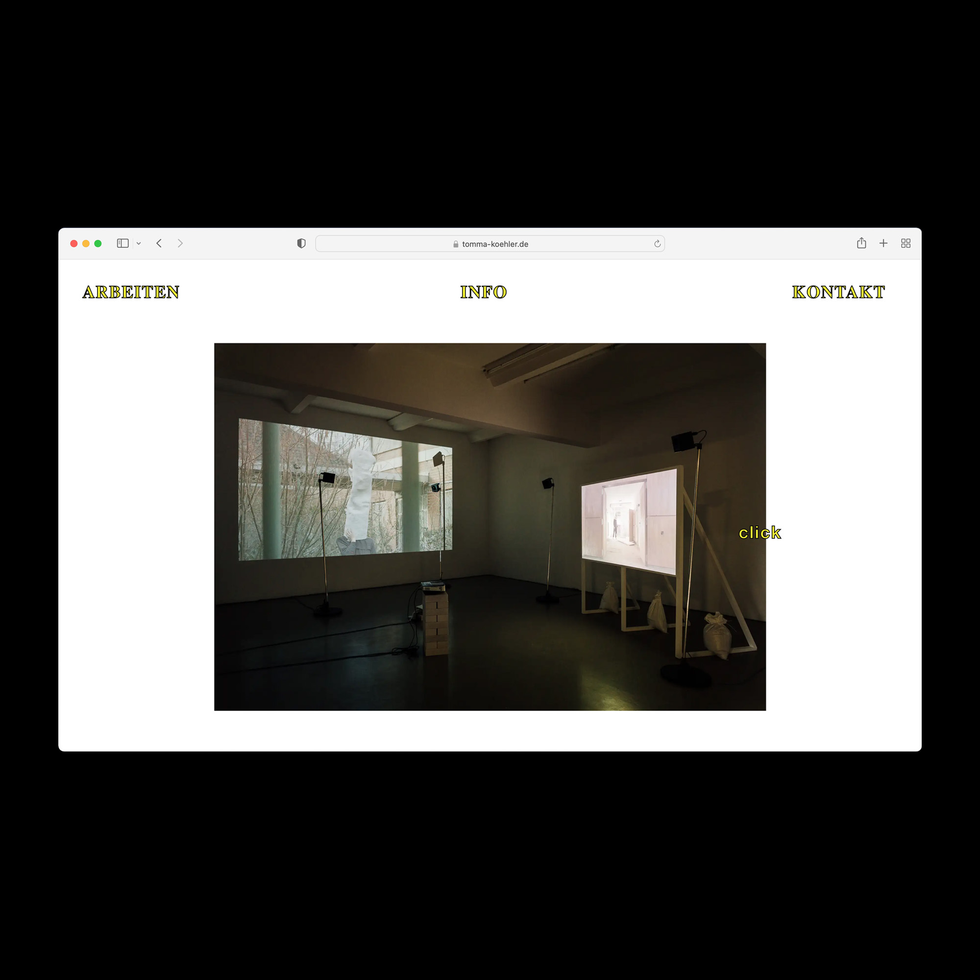 Webdesign for the artist Tomma Köhler. In her work the artist combines sculpture, video, performance and installation. In its pure and raw impression, the website is based on the artist´s method and use of material. Coding by Timon Bohn