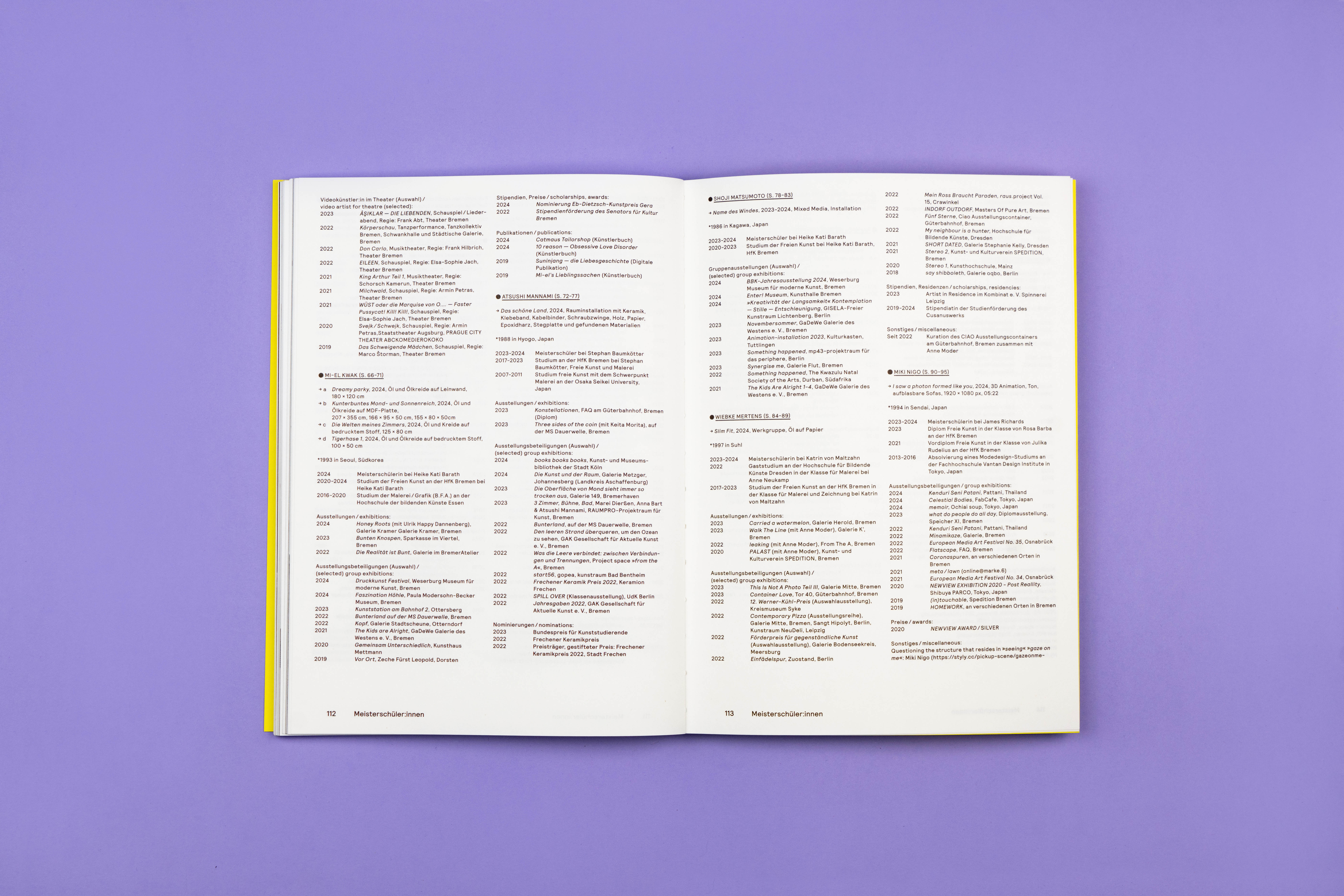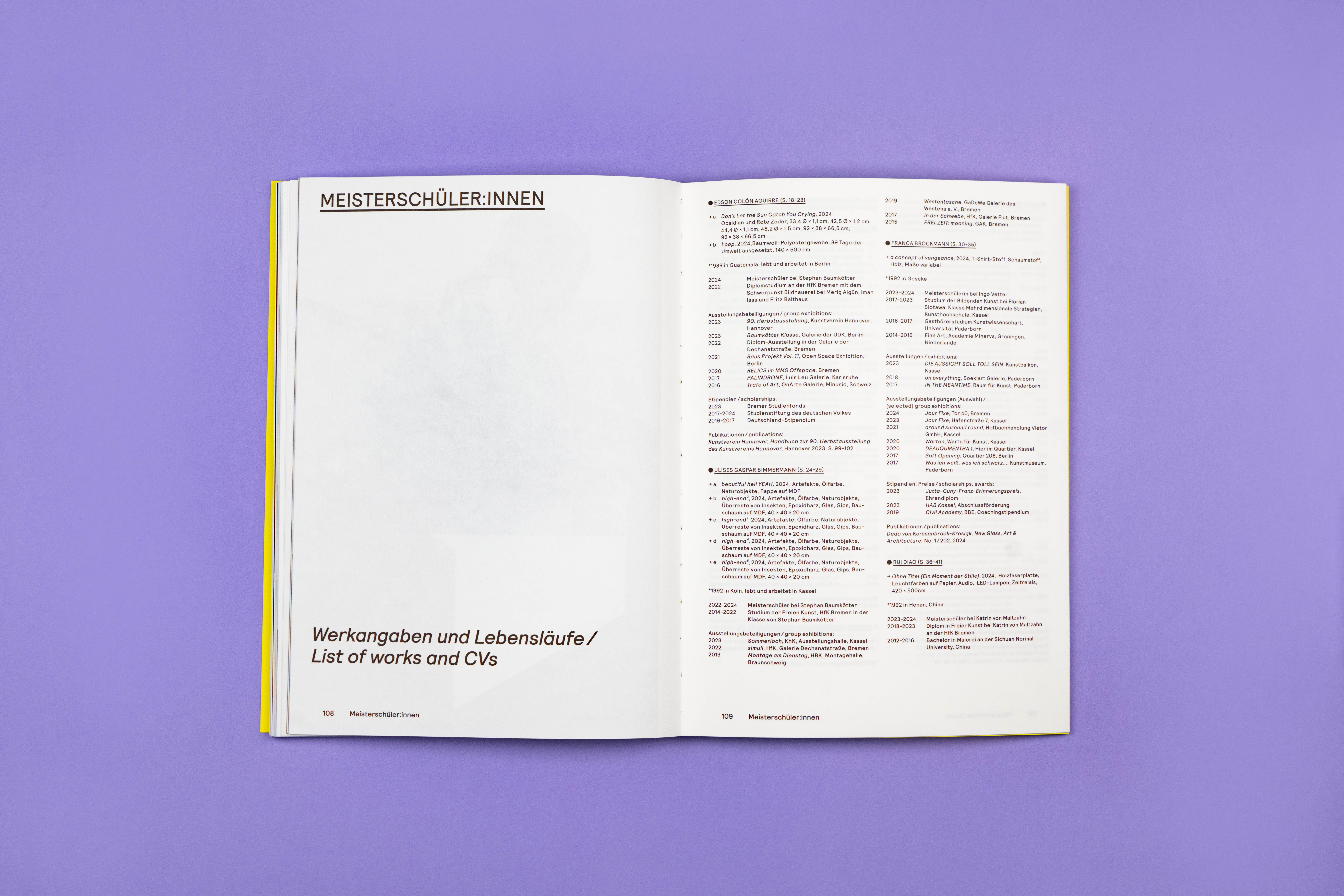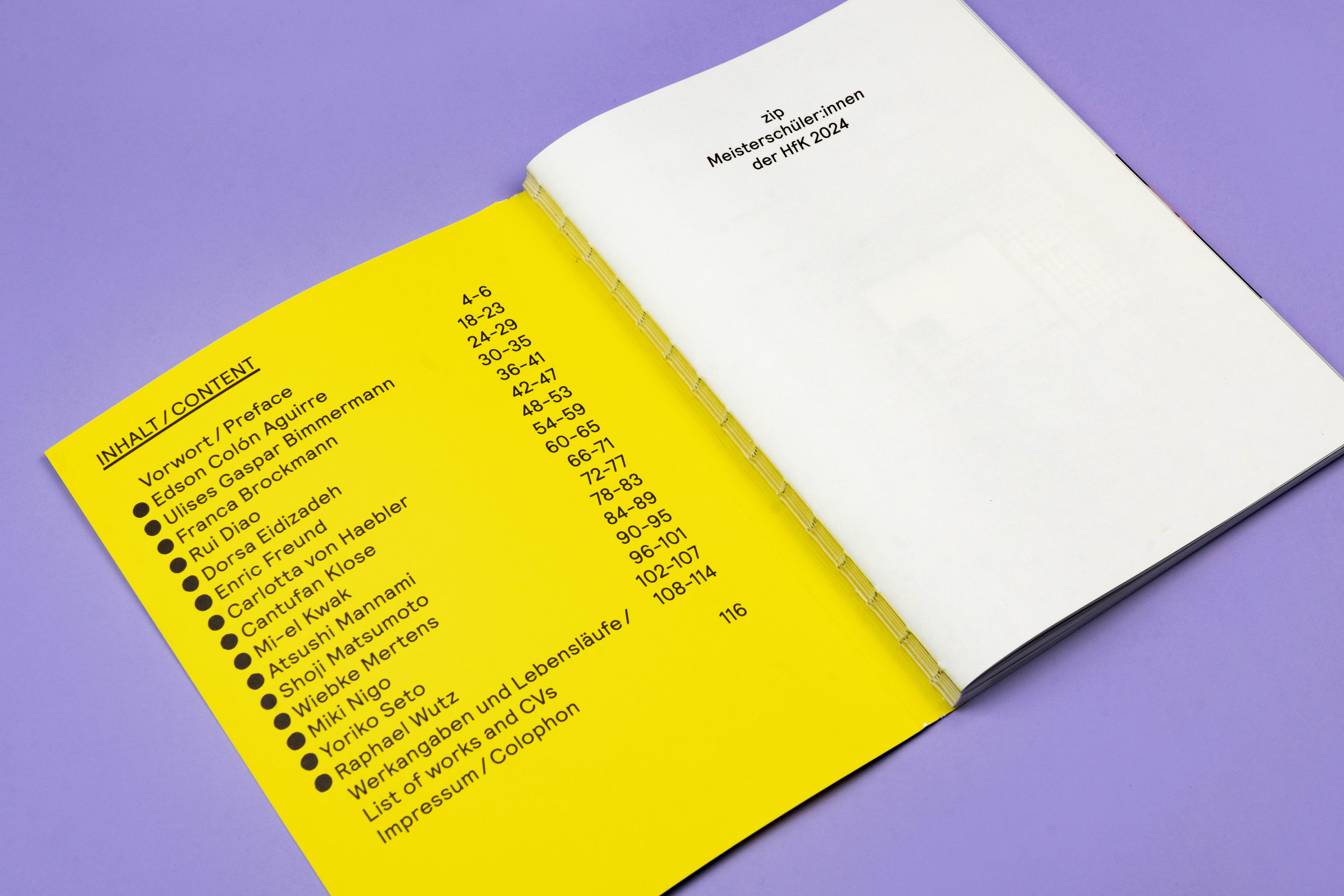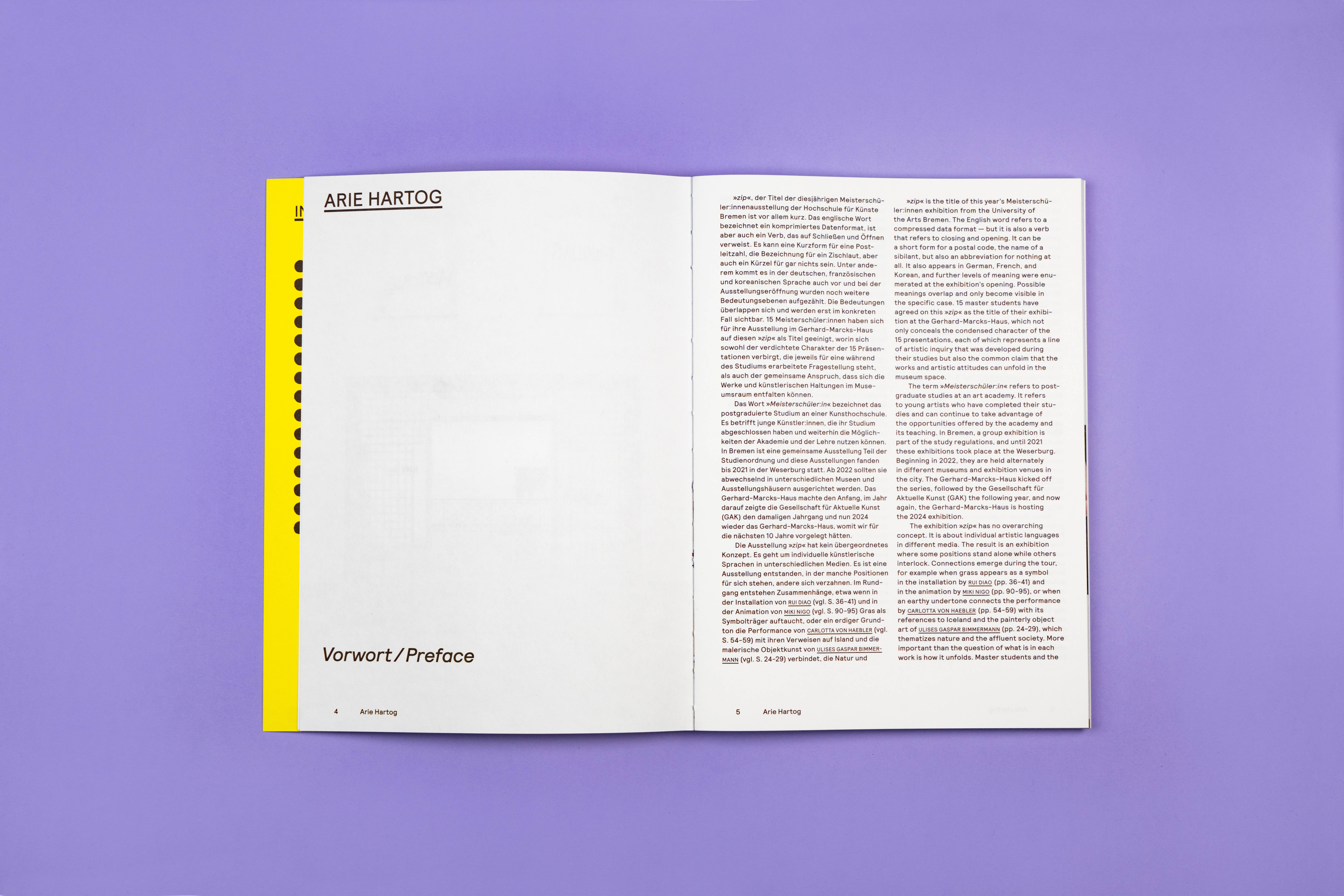 Bookdesign for the Meisterschülerinnen exhibition “zip”. The exhibition was displayed in Gerhard-Marcks-Haus in Bremen and showed paintings, sculptures, videos and installations. The texts about the artwork are in English and German. The reduced layout is in a chronological order, it puts a focus on the artists’ works.